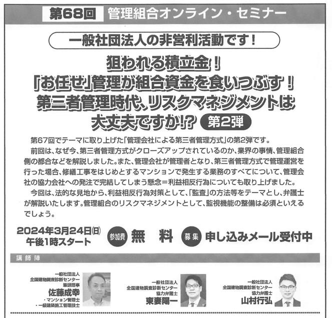 このたびは、第67回管理組合オンラインセミナーにご参加いただきありがとうございます。当セミナーは、12月24日午後1時からオンラインにて開催します。管理組合の皆様、お誘いあわせの上、ご視聴ください。