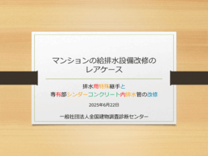 『マンションAI』では彪大な知識が生成されていきます。配管が床下でシンダーコンクリートに埋まり、そのコンクリートを取り除かなけれ|配管改修ができないケースなどのデータも蓄積されています。第2部では『マンションAI』によって導き出され、実際に全建センターのコンサルタントが管理組合に赴き、対応したレアケースを紹介します。