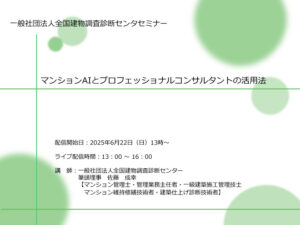 全建センターでは『マンションAI』が導き出した真のプ口中のプ口のコンサルタント(『マンションAI』認定コンサルタント)を紹介するサービスを開始します。マンションの老い、修繕積立金不足『マンションAI』の指示に従って管理組合のサポートをするコンサルタントの役割について、セミナーで詳しく説明します。