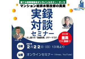 今回のセミナーでは、300 戸のマンション元理事長の馬場満喜榮氏と給排水管コンサルの第一人者である全建センター理事の木村章一氏に給排水管改修について熱く語ってもらいます。必ず参考になるセミナーです。ご期待ください。