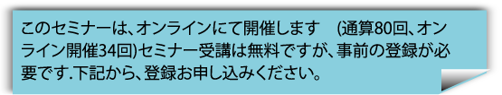 ただし、後日(開催1週間前および開催当日)、セミナー閲覧のご案内を登録いただいたメルアドに送信する関係から、事前の登録が必要です。